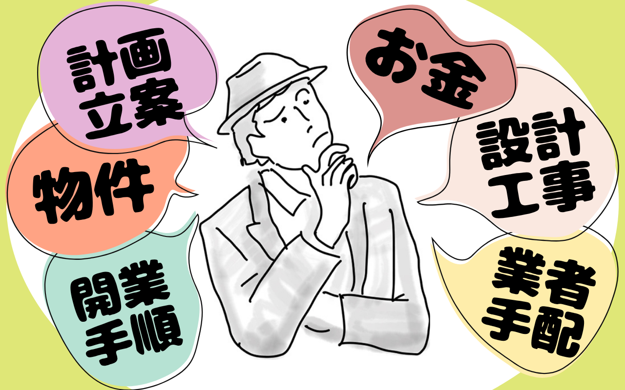 ●コンセプトメイキング ●開業計画(事業計画)立案 ●物件選定・不動産契約交渉 ●融資 ●設計 ●工事